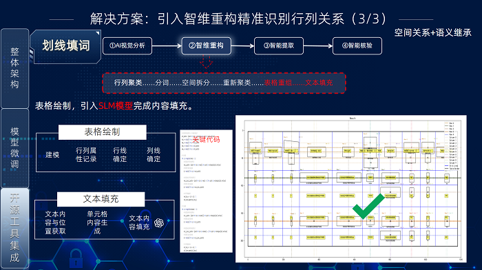 “智维重构”方案解决无边框表格识别和视觉粘连问题,其核心流程包含四步:行列聚类、粘连文本分割、表格重组和文本填充。